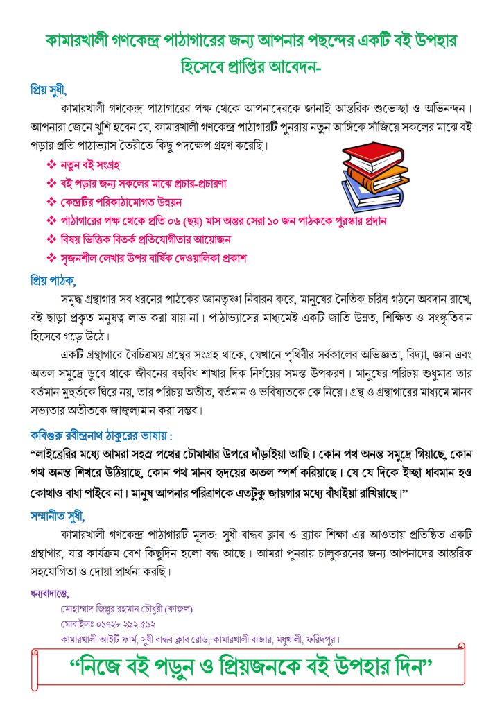 ফরিদপুরের মধুখালী উপজেলার সাবেক মেগচামী ইউনিয়নের নরকোনা গ্রামের বর্তমান কামারখালী ইউনিয়নের রাজধরপুর গ্রামের এবং আড়পাড়া উচ্চ বিদ্যালয়ের সাবেক ভারপ্রাপ্ত প্রধান শিক্ষক স্বর্গীয় নিতিশ কুমার মজুমদার এর দ্বিতীয় পুত্র বাংলাদেশ কৃষি ব্যাংকের অফিসার সুখদেব মজুমদার ফরিদপুর জেলার মধুখালী উপজেলার কামারখালীর ঐতিহ্যবাহী কামারখালী গণকেন্দ্র পাঠাগারে ডেল কার্ণেগী রচনাসমগ্র বই সবার পড়ার জন্য প্রদান করলেন । এ সময় তারই বন্ধুবর কামারখালী নিউজ এর সম্পাদক ও প্রকাশক মোঃ জিল্লুর রহমান চৌধুরী (কাজল) এবং সাংবাদিক সহিদুল ইসলাম সহ আরো গন্যমান্য ব্যক্তিবর্গ উপস্থিত ছিলেন। এ ব্যাপারে কামারখালী নিউজ এর সম্পাদক ও প্রকাশক মোঃ জিল্লুর রহমান চৌধুরী কাজল বলেন, ঐতিহ্যবাহী কামারখালী গণকেন্দ্র পাঠাগারকে আধুনিক মানের একটি পাঠাগার তৈরির উদ্দেশ্যে বই সংগ্রহরে প্রথম বইটি উপহার পেলাম আমার প্রিয় বন্ধু সুখদেব মজুমদারে কাছ থেকে। এই পাঠাগারে বিভিন্ন ধরনের বই রয়েছে। ক্লাবের সদস্যরা, স্কুল ও কলেজের ছাত্র-ছাত্রীরা এবং শিক্ষিত ছেলে -মেয়েরা খুব সহজেই নিয়মিত এই পাঠাগারে বই পড়তে পারবেন সেই প্রত্যাশায় আপনিও একটি বউ উপহার দিয়ে বই পড়ার আগ্রহ তৈরিতে উৎসাহ করুন সবাইকে ।