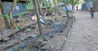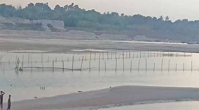 নদীর মাঝখানে বাঁধ দিয়ে ও কাথা জাল দিয়ে দেদার মাছ শিকার