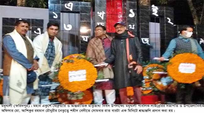 সোমবার একুশে ফেব্রুয়ারী মহান শহীদ দিবস ও আন্তর্জাতিক মাতৃভাষা দিবস উপলক্ষে একুশের প্রথম প্রহরে রাত ১২.০১ মিনিটে মধুখালী পাইলট উচ্চ বিদ্যালয় উপজেলা কেন্দ্রীয় শহীদ বেদীতে ফুল দিয়ে শ্রদ্ধা নিবেদন করেন উপজেলা পরিষদ ও উপজেলা প্রশাসন, আওয়ামী লীগ ও তার অঙ্গ ও সহযোগী সংগঠন, পৌর মেযর, পৌর আ‘লীগ, বিএনপি, সিপিবি, মধুখালী পাবলিক লাইব্রেরী, মধুখালী প্রেসক্লাব সহ বিভিন্ন রাজনৈতিক দল, বিভিন্ন স্কুল কলেজ, সামাজিক ও সাংস্কৃতিক সংগঠন সহ অর্ধশতাধিক ব্যক্তি ও প্রতিষ্ঠান শহীদদের প্রতি বিনম্র শ্রদ্ধা নিবেদন করেন।
